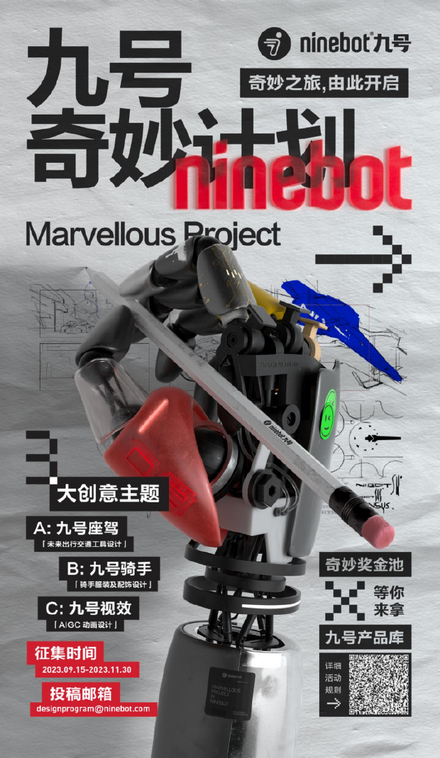 九号奇妙计划邀请你释放你的奇思妙想,启程前往通向未来的奇妙之旅。我们坚信,创意是前进的动力,是改变的源泉。而更美好的未来,将由我们共同创造。你的想法可能会让未来出行变得更加美好,天马行空的想象也许能变成大街小巷随处可见的出行爆款。这是一个展现神奇脑洞的舞台,也是一个将你的幻想变为现实的机会。九号公司鼓励参与者勇敢地突破常规,挑战自己的创意极限,为未来出行勾勒出更加令人惊叹的画面。